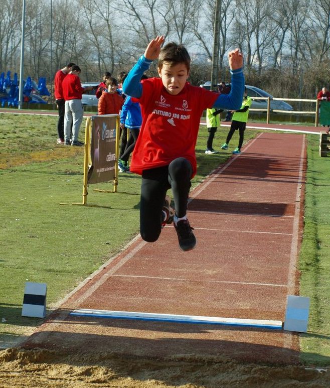2 pruebas a competición. El salto de longitud y la velocidad. 50 m. para benjamines, 60 m. para alevines y 80 m. para infantiles.